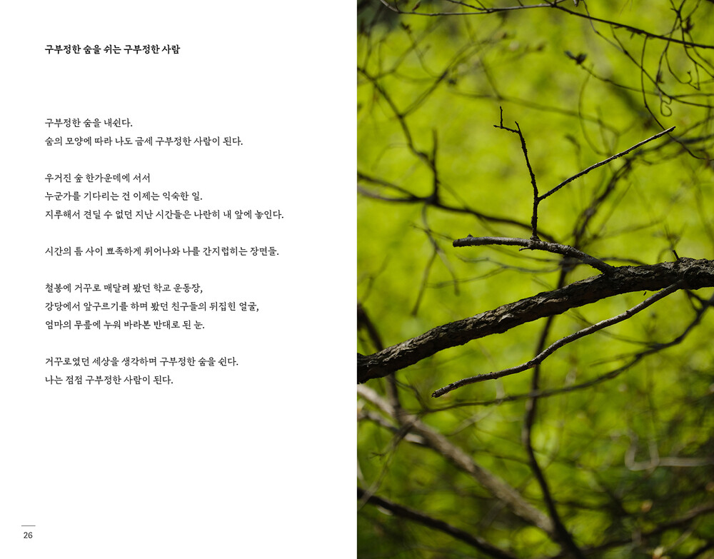 1년 동안 주변의 초록 풍경을 사진으로 담았다. 초록의 이미지를 담으며 계속해서 떠올린 것은 죽음이었다. 반짝이며 빛나는 것들 안에 기쁨이 있다면 그 뒷면에는 언제나 동일한 질량의 슬픔도 있다. 길을 걷다가 만난 초록 풍경도 마찬가지였다. 푸릇함이 주는 생명력을 보면 어쩔 수 없이 죽음이 떠올랐다. 생명이 있는 곳엔 죽음이 있고, 진실이 있는 곳엔 거짓이 있고, 순간이 있는 곳엔 영원이 있다. 서로 반대되는 것들 사이에는 도무지 떼어놓을 수 없는 단단한 연결이 있다. 우리가 보지 못하는 이면에는 또 다른 세계가 펼쳐진다. 서로가 없으면 그 무엇도 존재하지 않는 세계. 《포개진 계절》은 초록의 뒷면에 관한 책이다. 초록 뒤에 켜켜이 쌓인 수많은 계절과 죽음, 사라짐에 관한 이야기. 결국 이 모든 건 조화(harmony)에 관한 이야기이기도 하다.