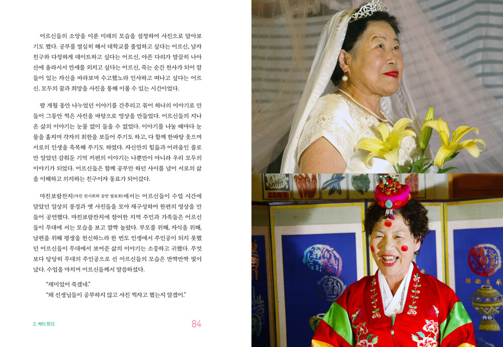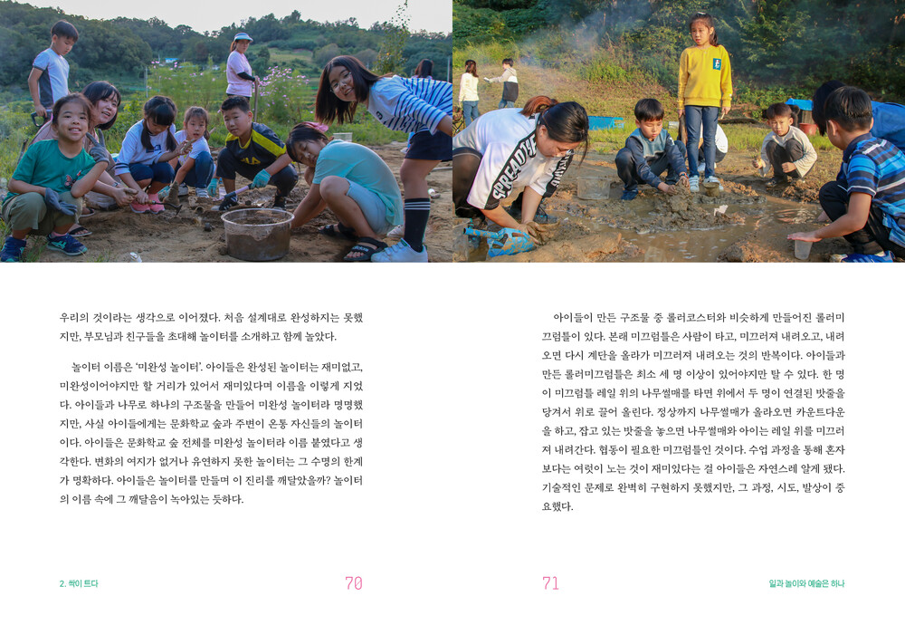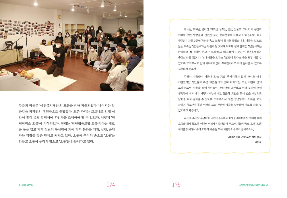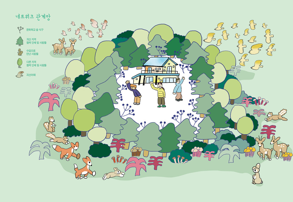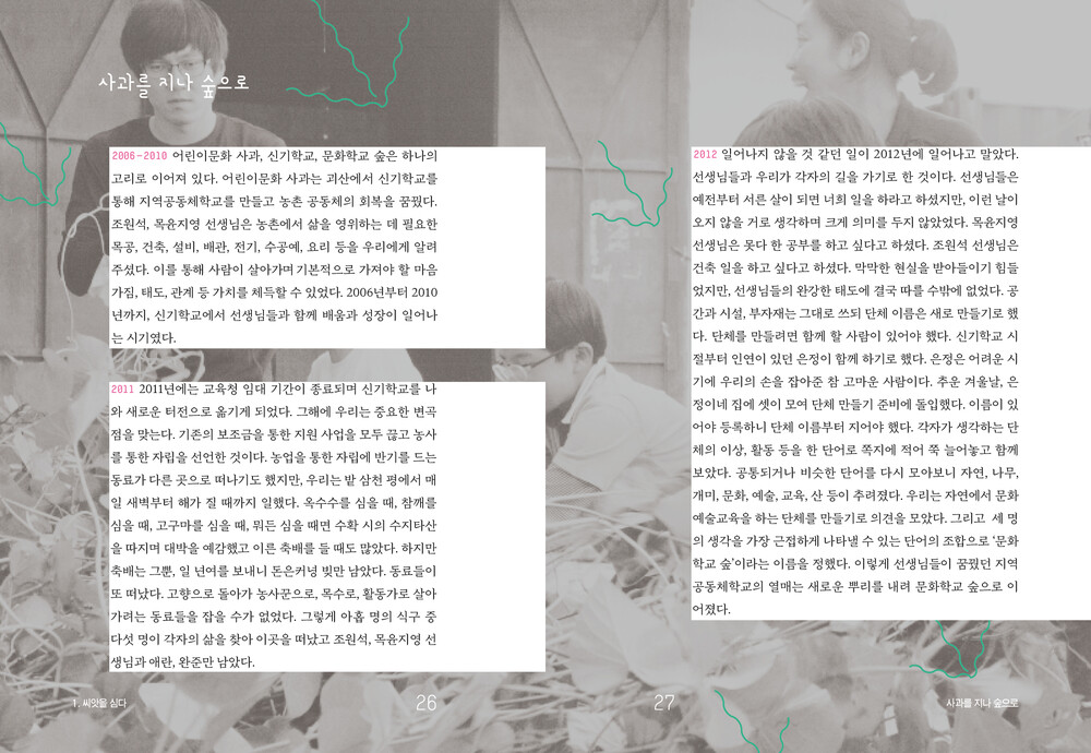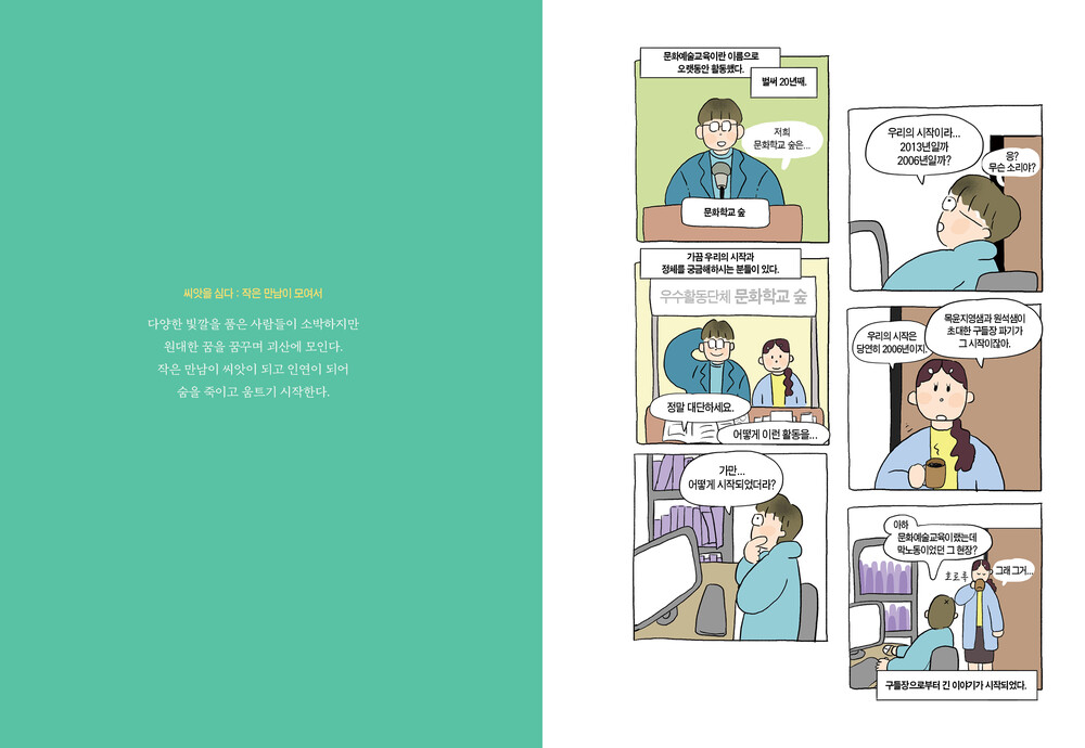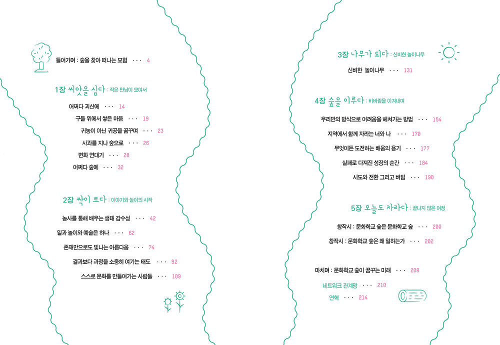 책은 씨앗을 심고, 싹을 틔우고, 나무를 키우고, 숲을 이루고, 성장해 온 여정을 다섯 장으로 구성하고 있다. 여기에 담긴 순간들은 단순히 ‘교육’이라는 이름으로는 정의될 수 없는 살아 있는 경험이다. 이는 문화예술교육이 지역에서 무엇을 가능하게 하고, 어떠한 변화를 만들어 낼 수 있는지를 끊임없이 질문해 온 과정이기도 하다. 문화학교 숲이 실천해 온 지난 시간은 농촌에서의 문화예술교육 활동이 어떻게 삶의 다양한 가능성과 새로운 대안을 만들어낼 수 있는지를 생생히 보여준다. 지역민들과 함께 공동체의 또 다른 방식을 모색하며 성장해 온 이들의 발자취는, 지금 우리가 있는 자리에서 어떤 숲을 만들어가며 살아가야 하는지를 되묻게 한다. 농촌이라는 특별한 환경 속에서 문화예술이 사람을 만나 만들어 낸 따뜻하고 단단한 기록들. 이들의 이야기가 누군가의 씨앗이 되어 풍성한 숲으로 자라나기를 바란다.